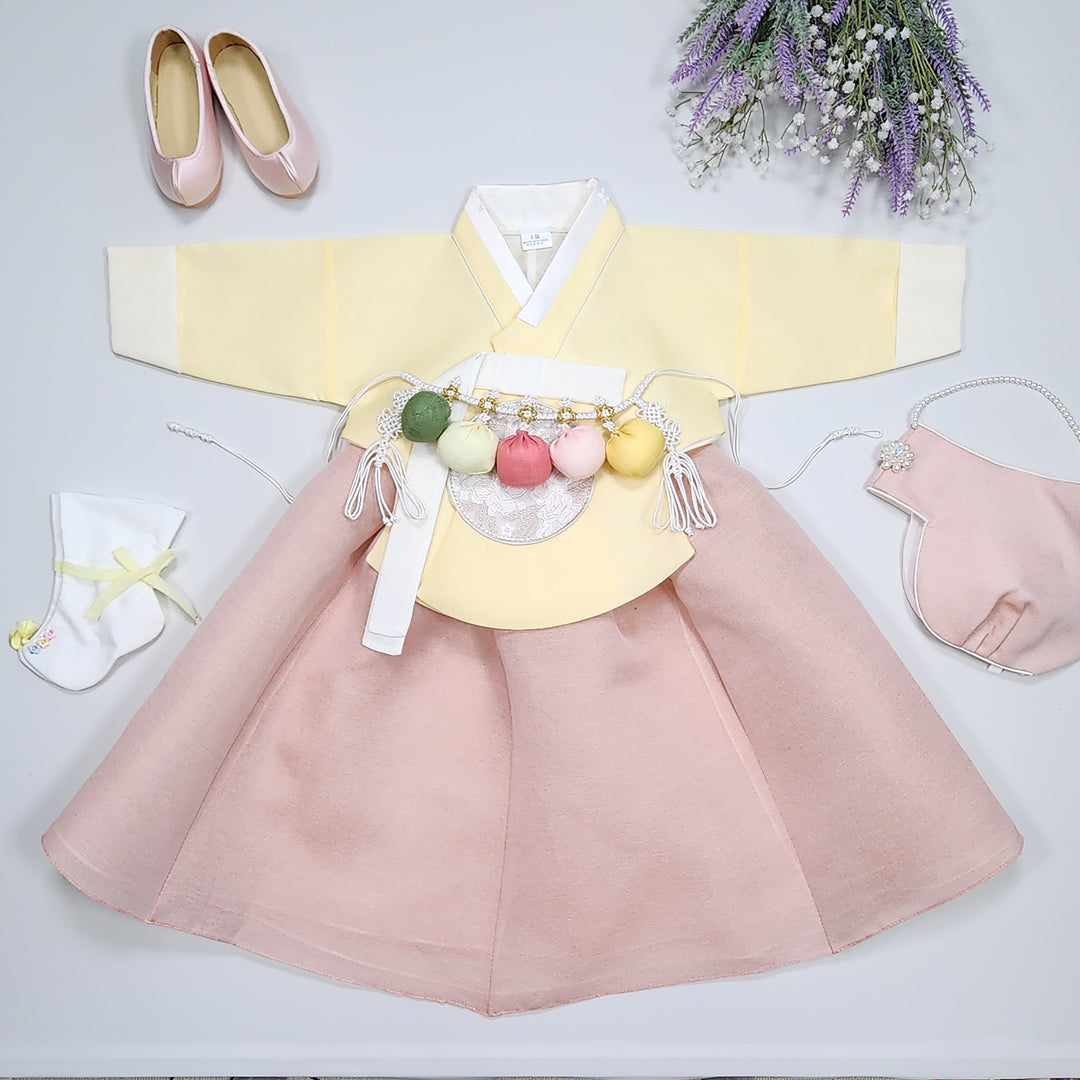 Hanbok Girl Baby Korea Traditional Clothing Set First Birthday Celebration Party 100th Birth Celebration 1–15 years Light Pink Cute Yellow HG164