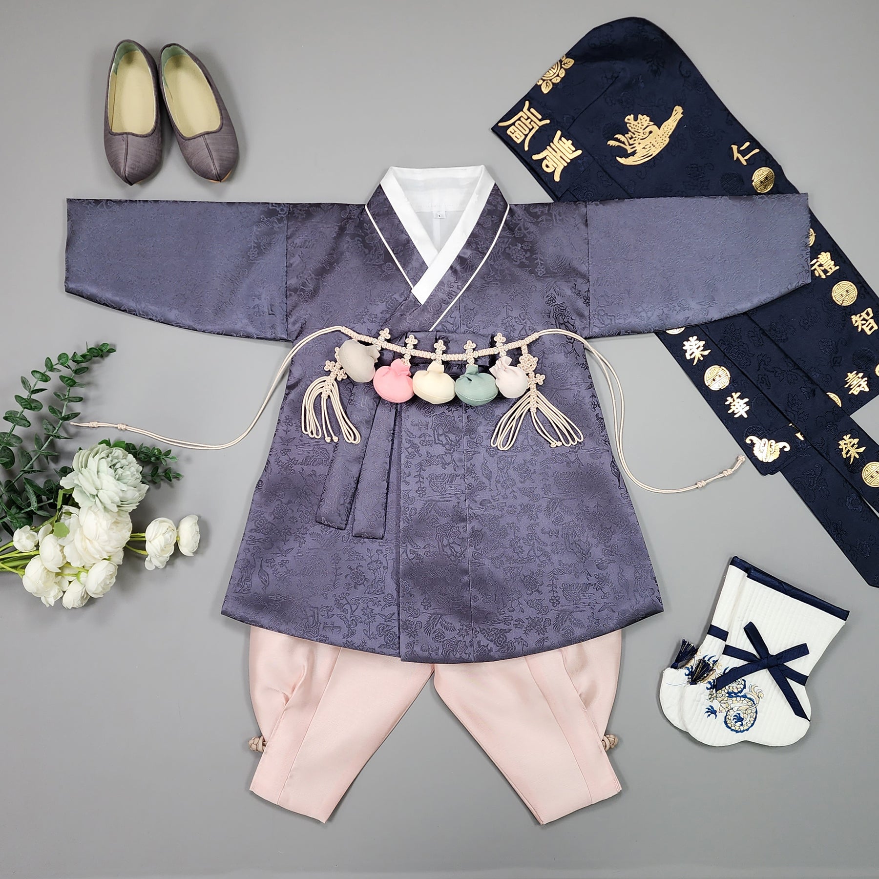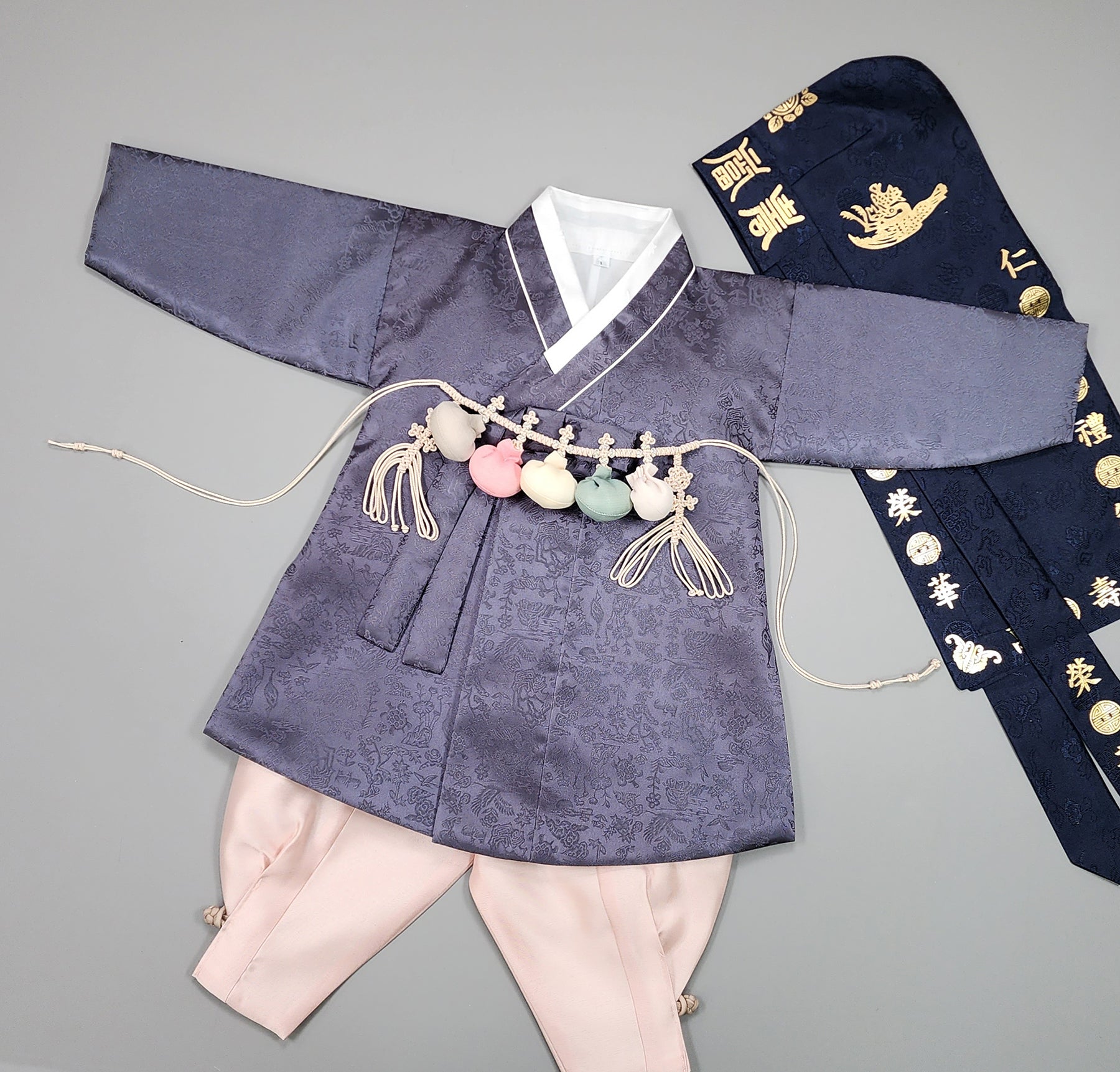 Dark Green Hanbok is traditional clothing of Korea. And the child would be dressed up the Hanbok in the first birthday.