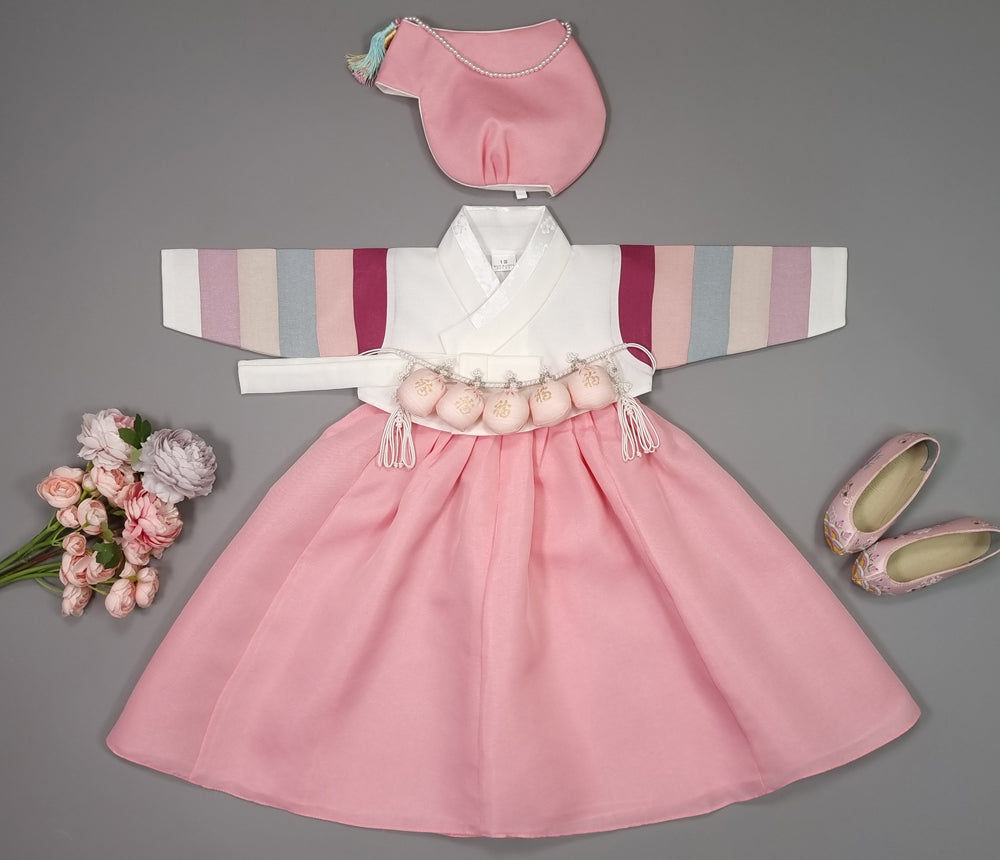Hanbok Girl Baby Traditional Korean Clothing Set First Birthday (Dol) & 100th Day Celebration Ages 1–15 | White Saekdong Top & Pink Skirt | HG101