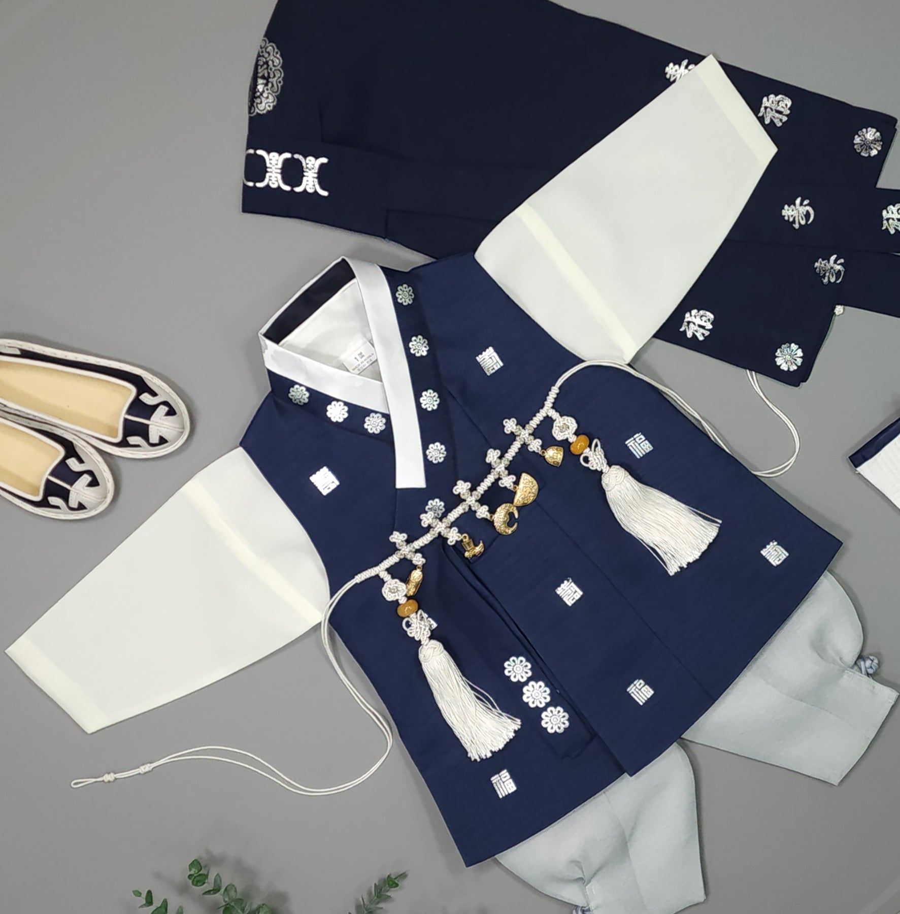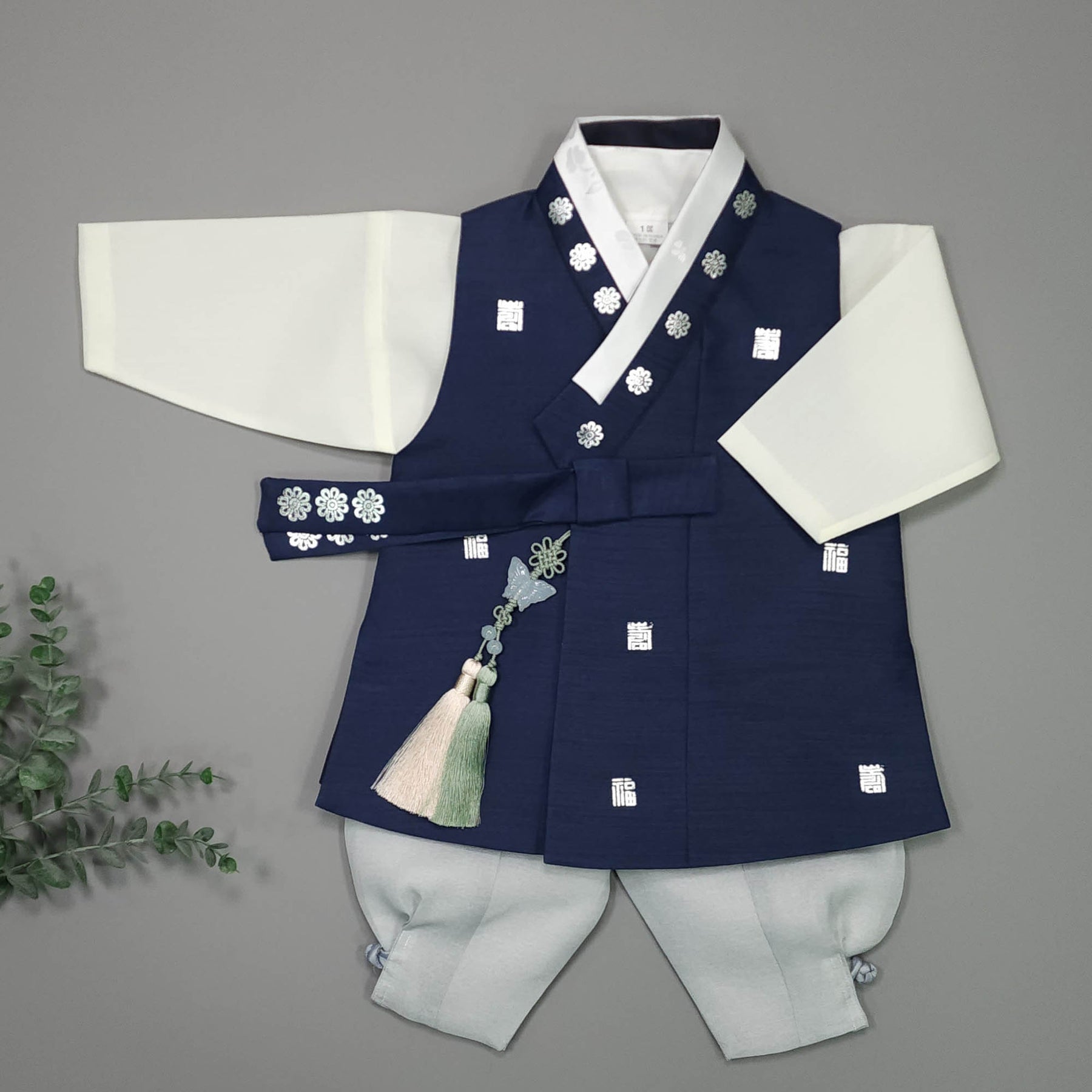 Dark Green Hanbok is traditional clothing of Korea. And the child would be dressed up the Hanbok in the first birthday.