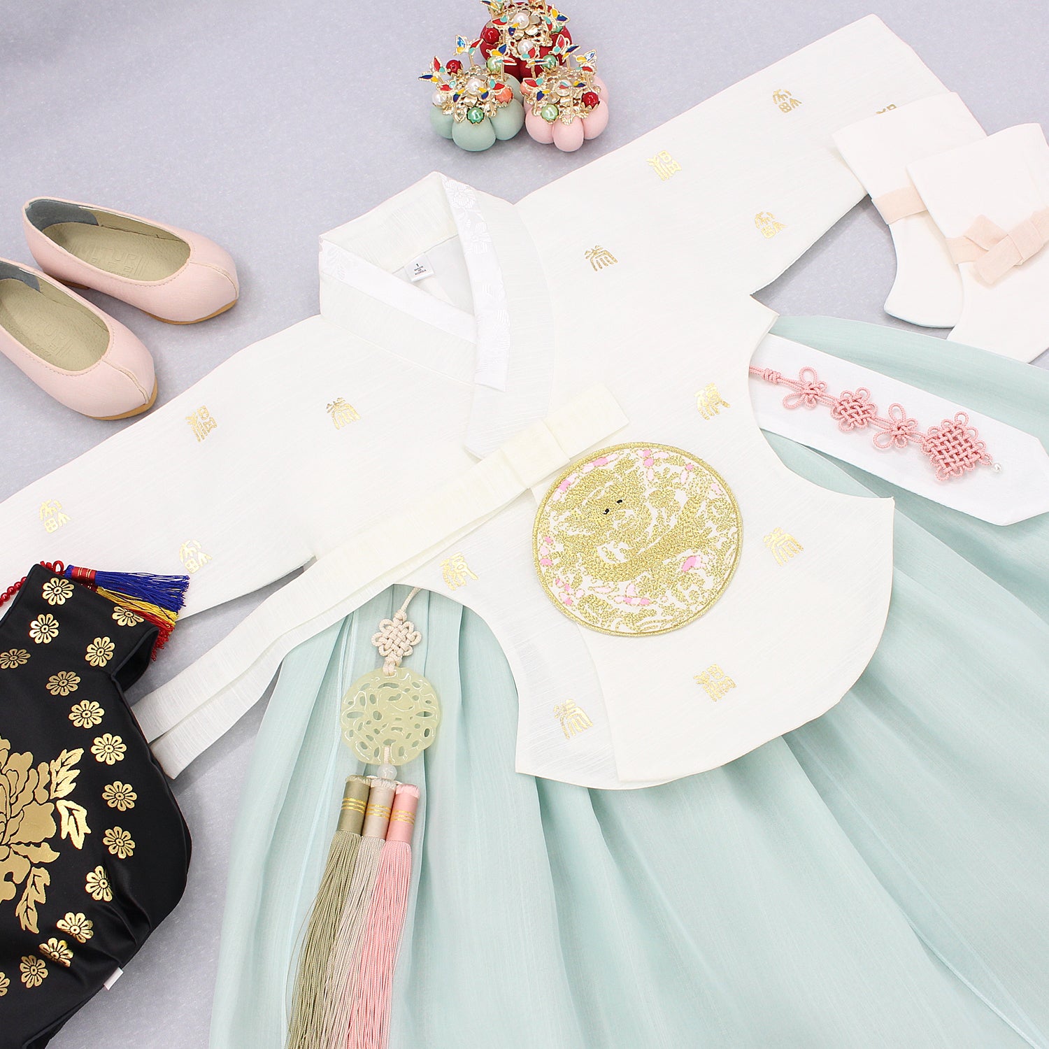 Hanbok Girl Baby Korea Traditional Clothing Set First Birthday Celebration Party 1–6 years 100th days Ivory Mint Gold Print DGH120