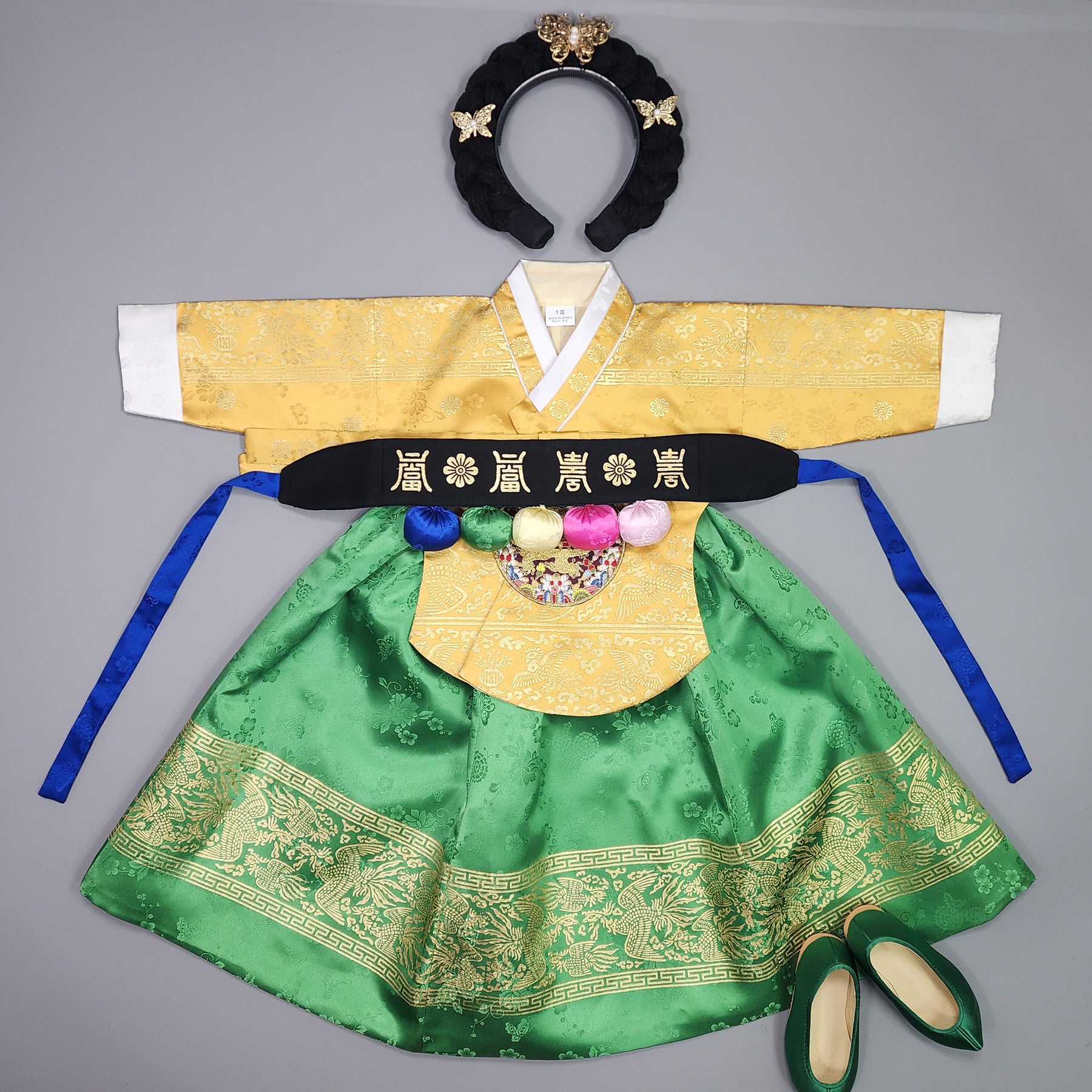 Hanbok Girl Baby Korea Traditional Clothing Set First Birthday Celebration Party Celebration 1–10 Years Green Skirt Gold Print HG121