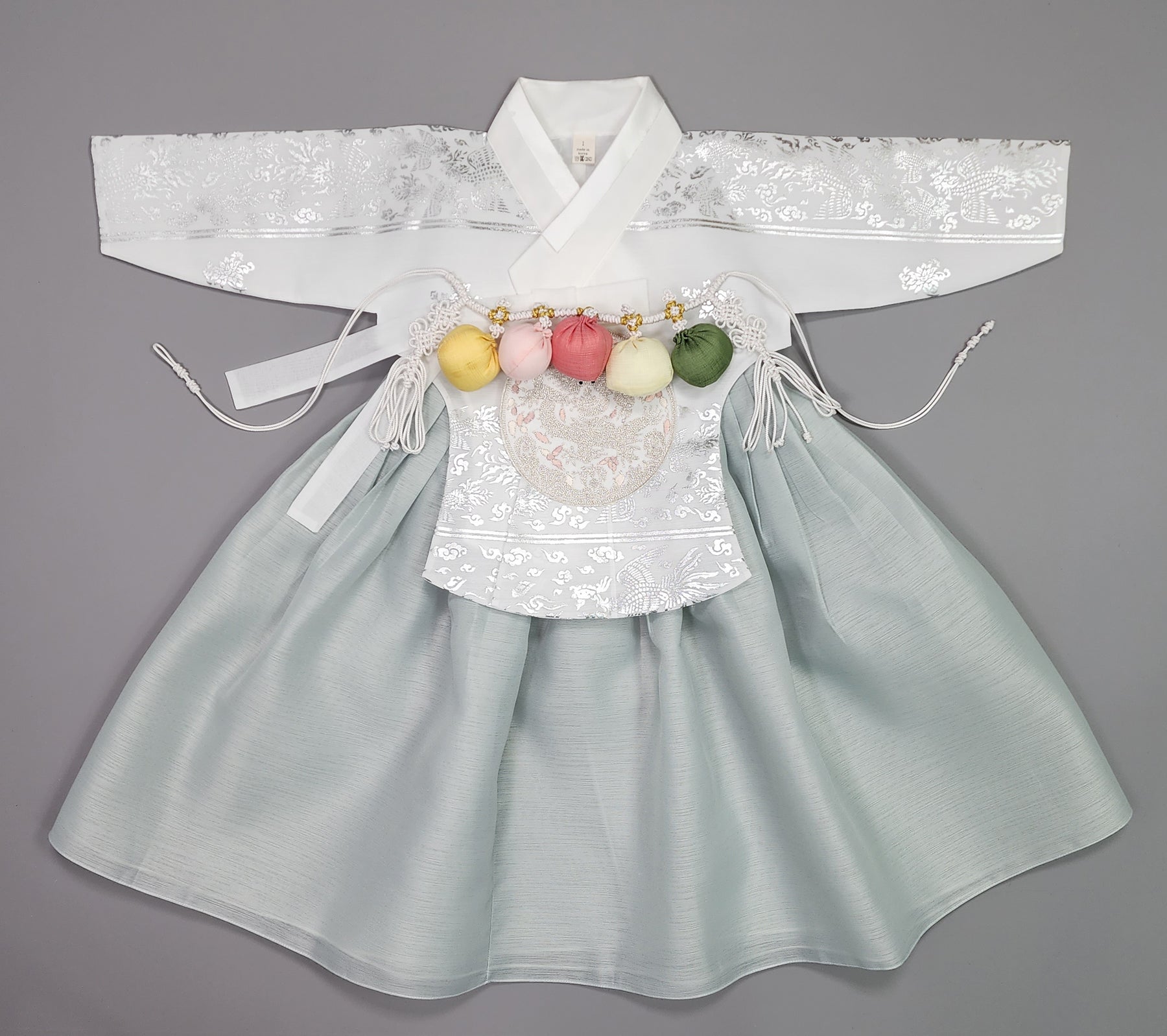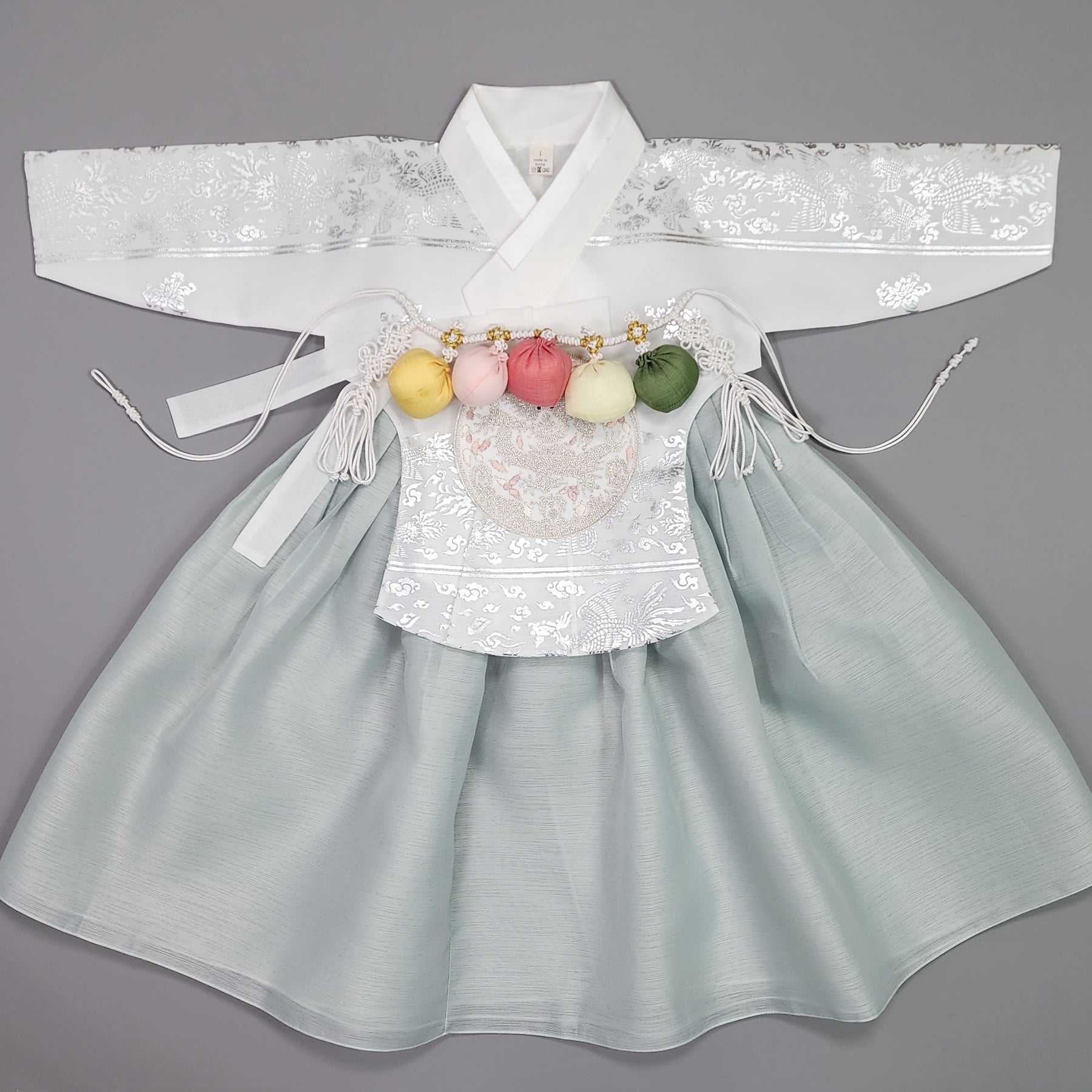Dark Green Hanbok is traditional clothing of Korea. And the child would be dressed up the Hanbok in the first birthday.