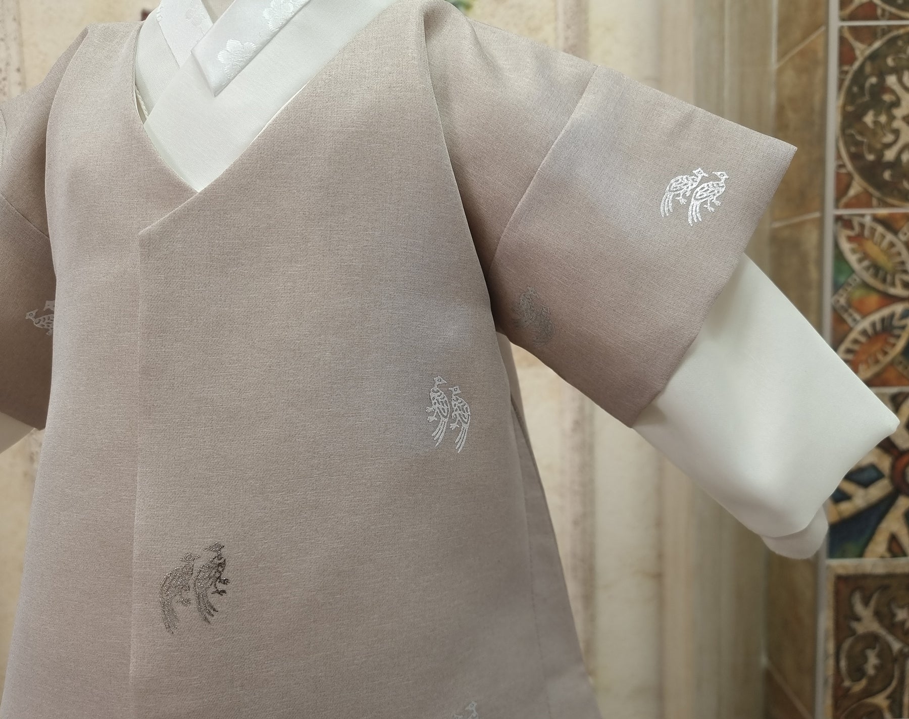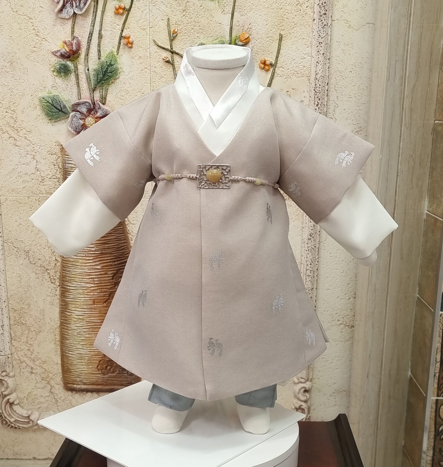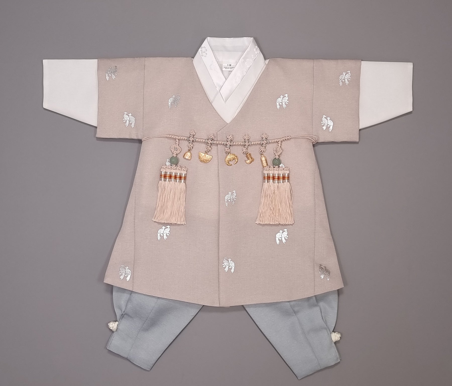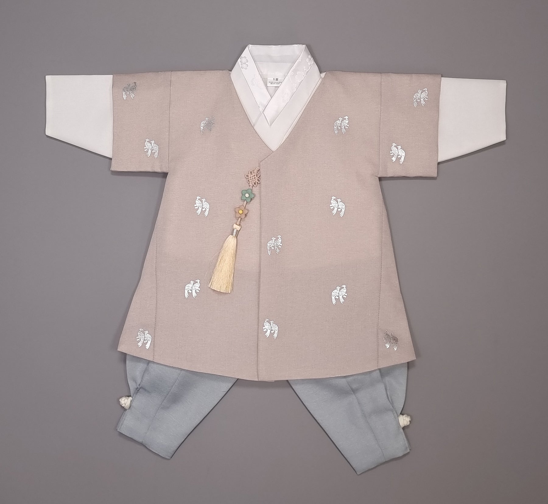 Korean Traditional Boy Baby Hanbok Dol Baikil Party Celebration 100th-10 Ages Beige Bird Silver Print HGB113